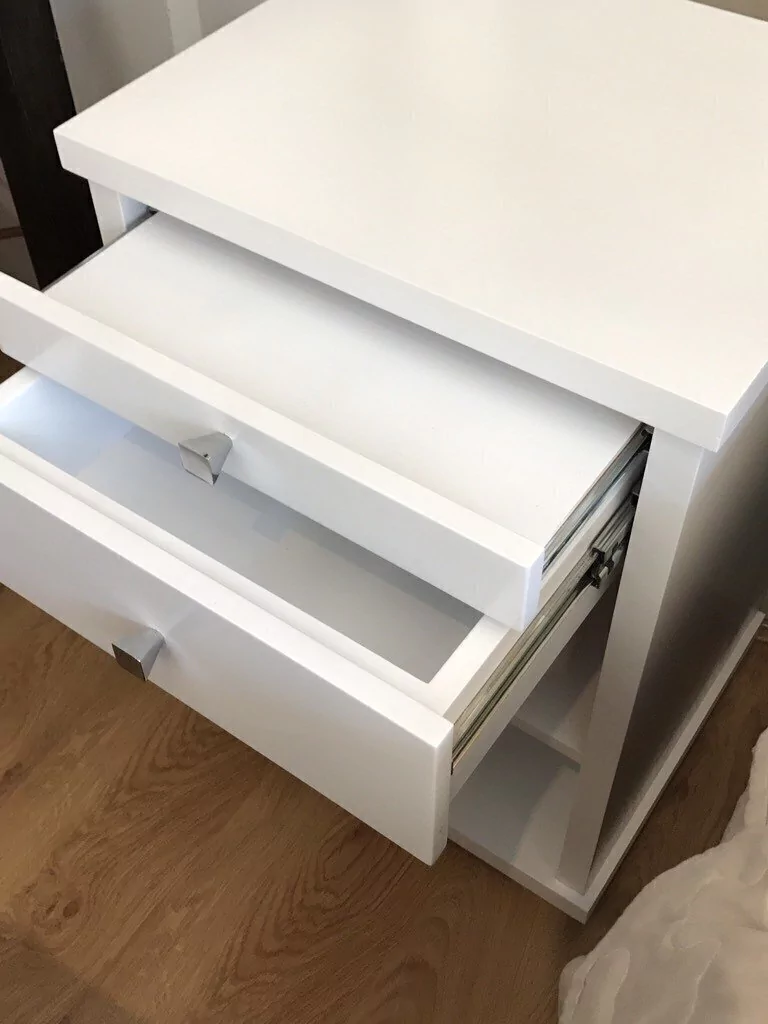 Madera laqueada en poliuretano blanco, con sistema de correderas telescopicas que permite un acceso al 100% del cajón.