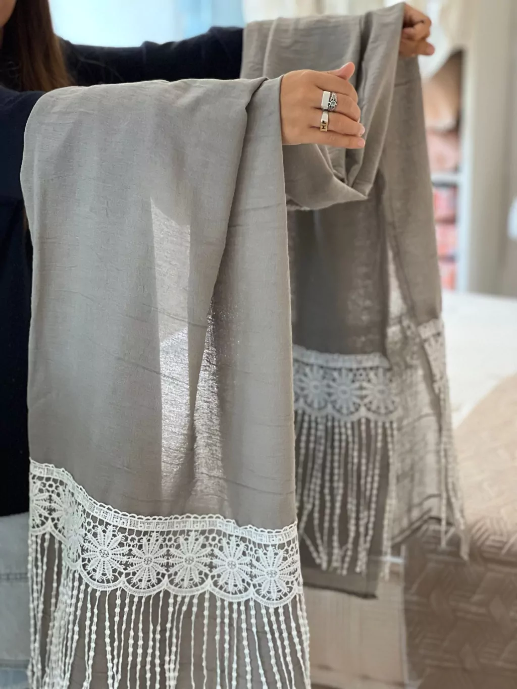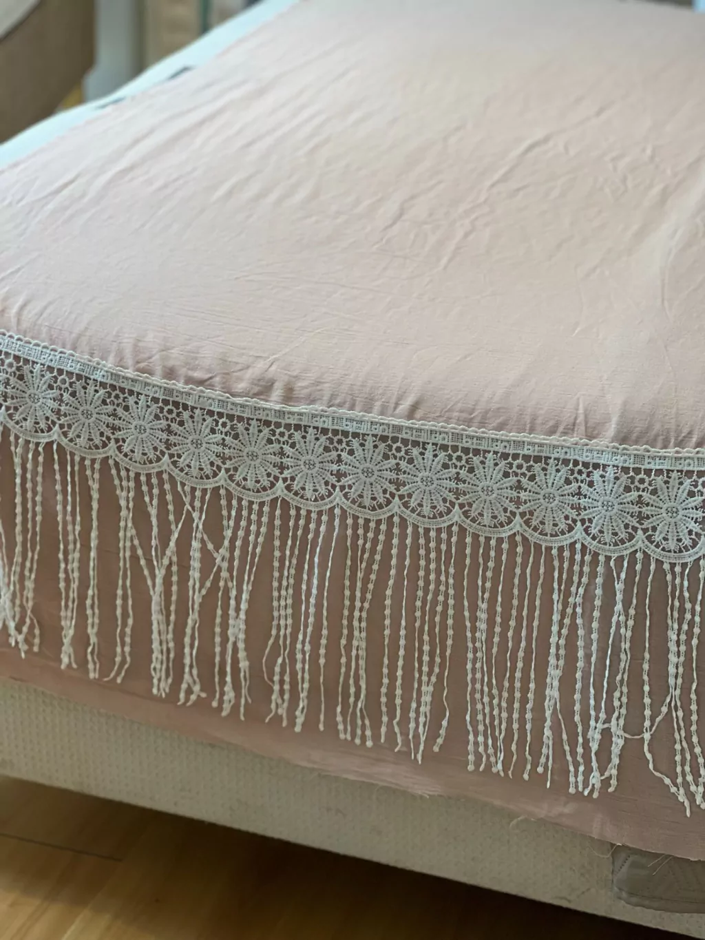 Pie de cama en gasa de algodón con flecos en guipure de algodón.