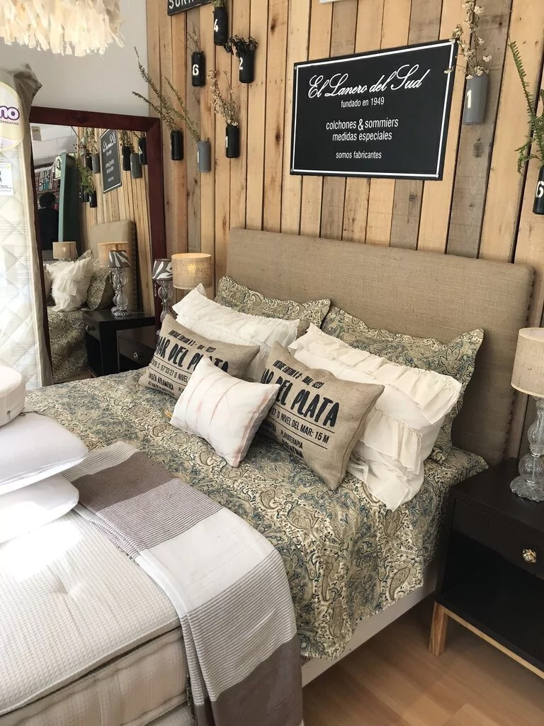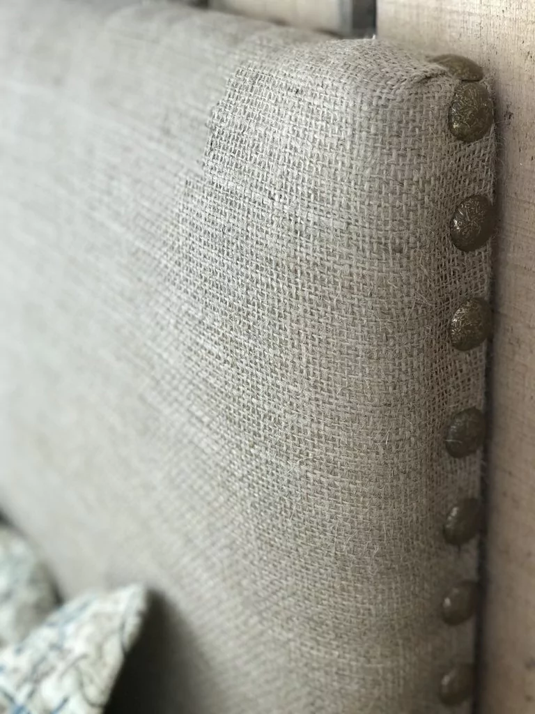 Tapizado en Arpillera rústica con tachas oxido en los laterales.